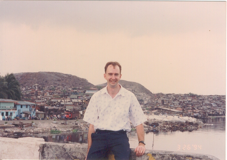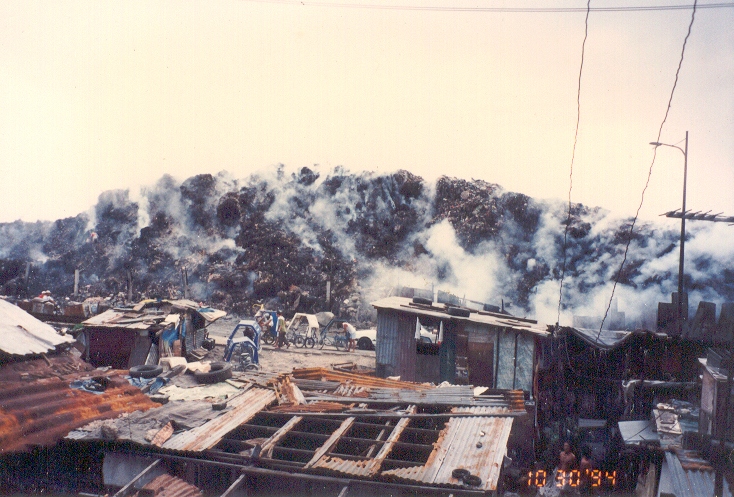 A picture of Derek in front of Smokey Mountain. This picture was taken around 1994. The "mountains" behind Derek were composed of piled up, burnt garbage.